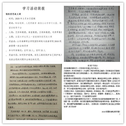 课程结束后,思政老师组织学生们在线讨论,深化了对相关内容的认识。各院系的学子们,通过不同的形式去感悟这次思政课的“高”“大”“上”,航海学院的学生中入党积极分子看完直播后写出思想汇报。国旅学院的学生以班级为单位拟出观看后的学习简报,航空学院、港航管理学院、电商学院和中职学院的学生们以观后感的形式去描述自己的感悟。
