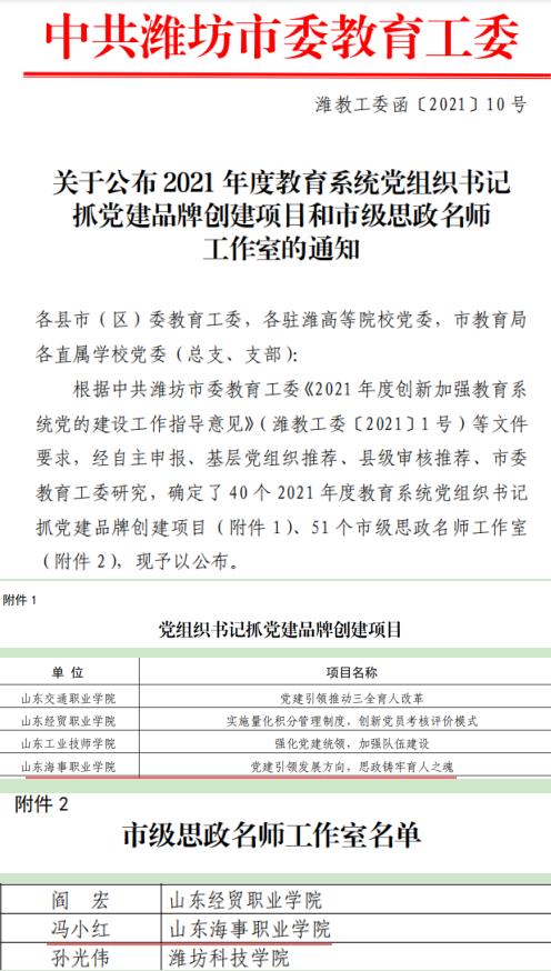 5月17日,根据中共潍坊市委教育工委发布的《关于公布 2021 年度教育系统党组织书记抓党建品牌创建项目和市级思政名师工作室的通知》,我校教学党支部书记冯小红申报的《党建引领发展方向,思政铸牢育人之魂 》项目和思政名师工作室分别获批潍坊市2021年度教育系统党组织书记抓党建品牌创建项目和市级思政名师工作室。