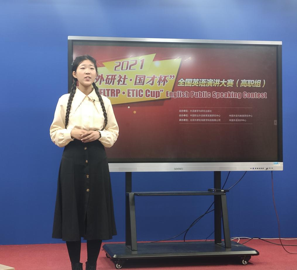 近日,在由教育部高等学校大学外语教学指导委员会与山东省教育厅高等教育处指导的2021“外研社·国才杯”全国英语演讲大赛(高职组)复赛山东赛区中,我校21级口腔医学技术专业孔鲁倩同学荣获二等奖,指导教师咸静获得“优秀指导教师”称号。