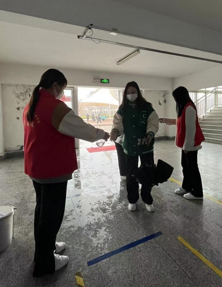 学生曹涵宇说:在当志愿者的过程中,我看到了老师们的不易,在他们工作忙碌的时候我们会主动去帮老师排忧解难。希望我们能够彼此携手,共抗疫情!