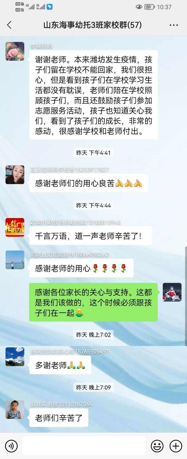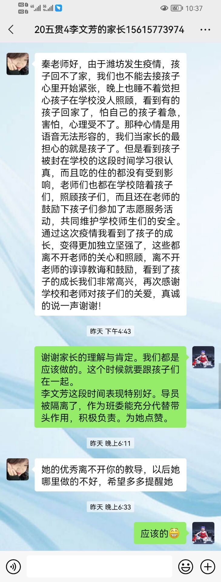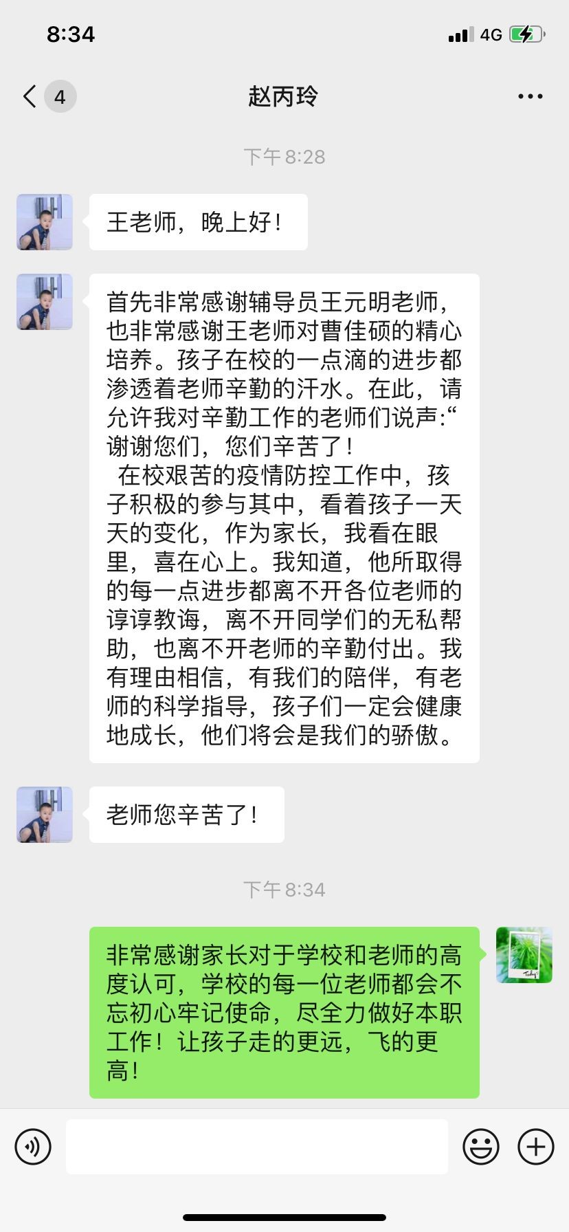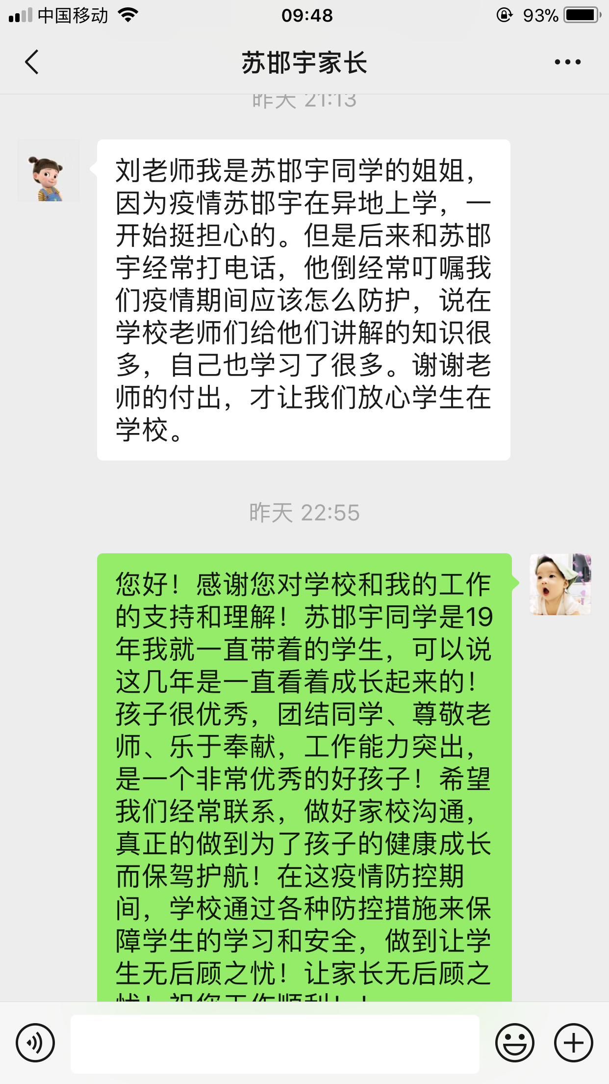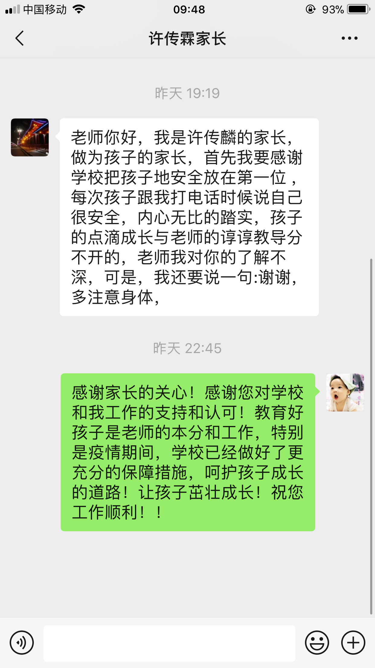 疫情之下,面对留在学校的孩子们,“平安”两个字是家长最大的心愿,孩子在学校的一举一动都牵动着家长的心。我校教师作为家长和学生之间的关键纽带,积极做好与学生家长的沟通交流工作,定期与家长沟通学生在校情况,及时反馈学生问题,为的就是让家长能够安心、放心、舒心。在与家长的沟通过程中,也得到了家长们的充分理解与肯定: