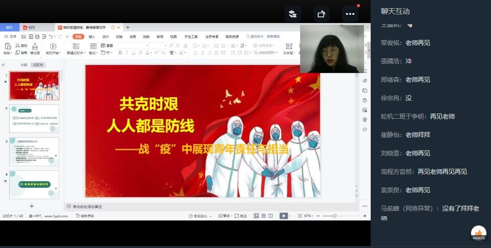 4月7日晚,来自我校马克思主义学院的周玉洁老师为大家带了一场别开生面的疫情思政课。周老师从“新冠疫情当前形势”、“新冠疫情防疫策略”、“保持积极乐观心态”和“以国之名,致敬英雄”四个方面带领师生深入学习中央有关疫情防控工作的相关文件精神,激励和引领广大师生在疫情防控中自觉贡献力量,展现战“疫”里的青年责任与担当。