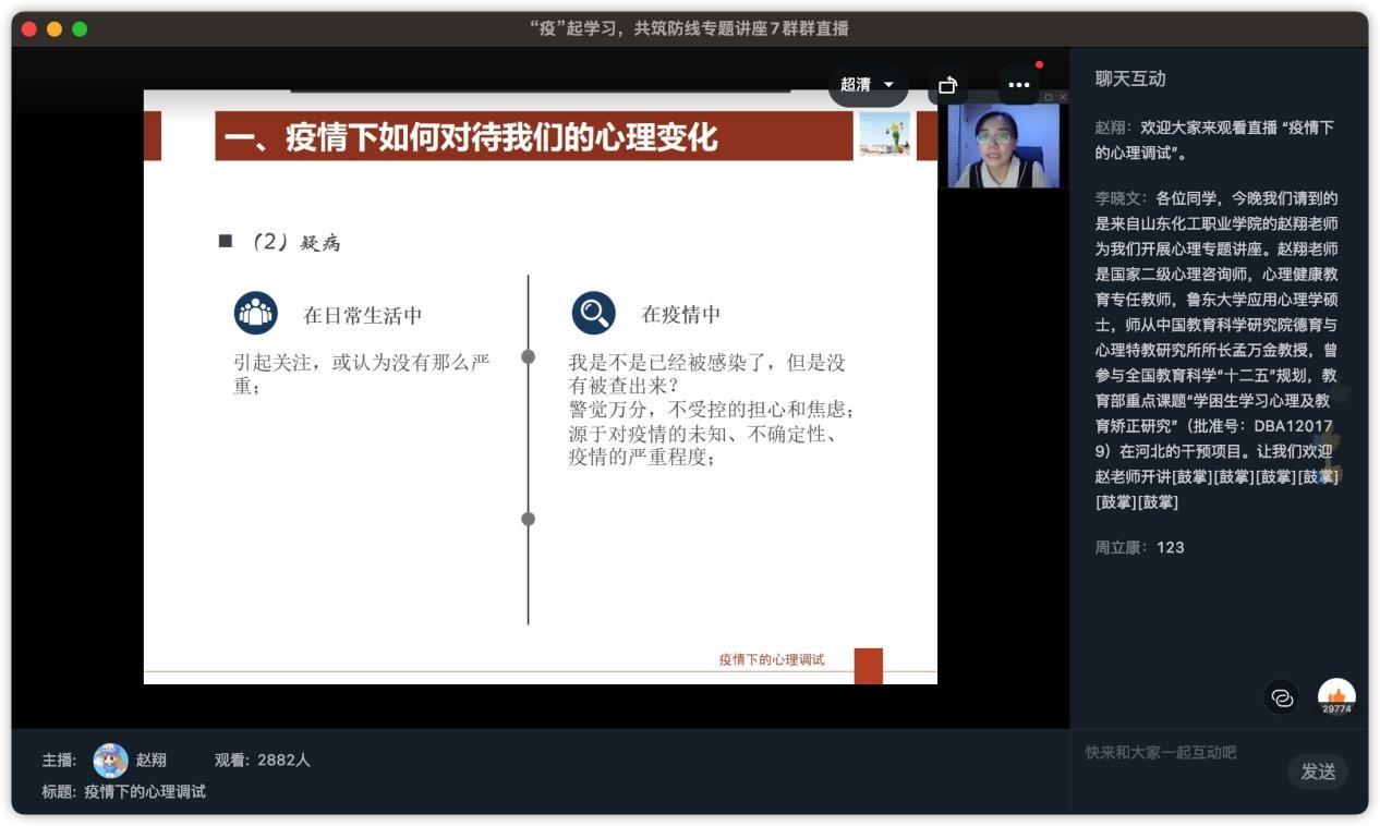 4月8日晚,山东化工职业学院心理教研部主任、国家二级心理咨询师赵翔老师做客直播间,为我们带来了“疫情下的心理调适”主题讲座。赵翔老师从保持阳光心态,做好疫情下的心理调适这一角度出发,对师生员工心理疏导和心理健康宣传教育,展现疫情给我们的心理活动和个人生活带来的影响,科普面对消极影响时缓解压力和焦虑情绪的方法,助力广大师生员工在疫情背景下进行科学、有效的心理建设。