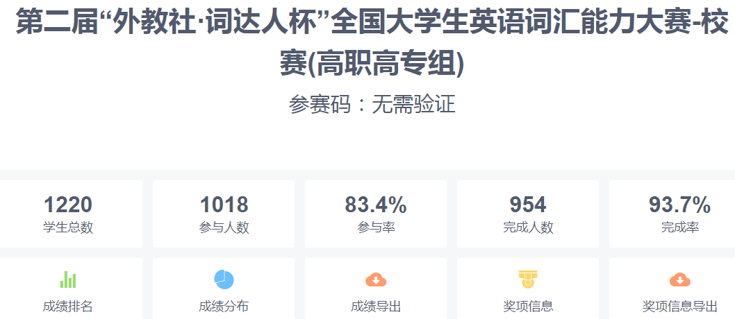本次大赛由山东省本科教育通用外国语种类专业教学指导委员与山东省外语职业教育行业教学指导委员会等部门主办,依托外教社“词达人”英语词汇智慧学习平台在线举办。学生通过手机端注册登录参赛,赛题以高等学校英语应用能力考试A、B级词汇及课程思政相关词汇为基础,参赛选手在“词达人”平台完成竞赛试题作答,系统自动核算成绩,确定排名。