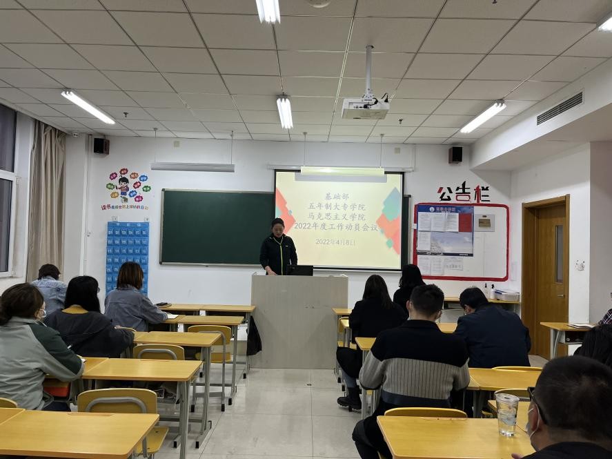 2022年4月8日,基础部、马克思主义学院、五年制大专学院在三号楼3403教室组织召开2022年度工作动员会议。由于疫情期间部分教师居家办公,为保证全员参与,会议采用线上线下相结合的方式进行。本次会议由基础部主任(五年制大专学院院长、马克思主义学院院长)冯小红主持,各分管中层分别对2022年度重点工作进行了部署。