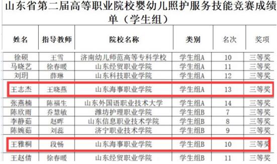 近日,山东省第二届高等职业院校婴幼儿照护服务技能竞赛成绩公布,我校基础部2021级婴幼儿托育服务与管理专业学子王志杰、王雅桐在王晓燕、段畅两位老师的指导下获三等奖2项。