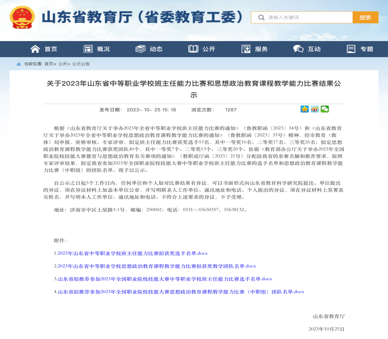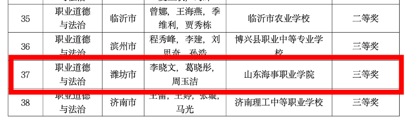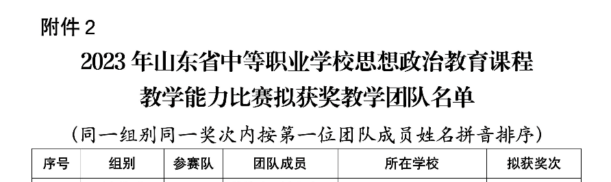 10月25日,山东省教育厅对2023年山东省中等职业学校思想政治教育课程教学能力比赛结果进行公示,我校李晓文教师团队荣获大赛三等奖。