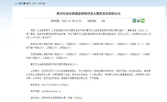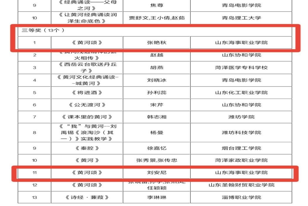 为深入学习贯彻党的二十大精神,认真践行习近平总书记关于深入推动黄河流域生态保护和高质量发展的重要讲话精神,推进黄河文化深度融入学校课堂教学,省教育厅、省语委办举办黄河文化经典诵读课例评选大赛。11月8日,山东省语言文字工作委员会公示2023年参加“黄河文化经典诵读课例评选大赛”获奖名单,我校教师张艳秋、刘安尼老师分别获得视频微课类大学教师组三等奖。