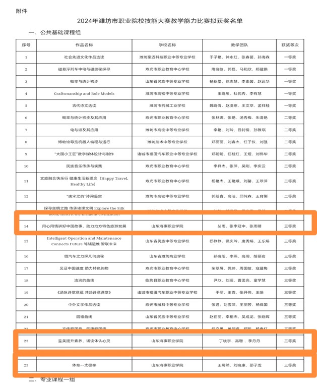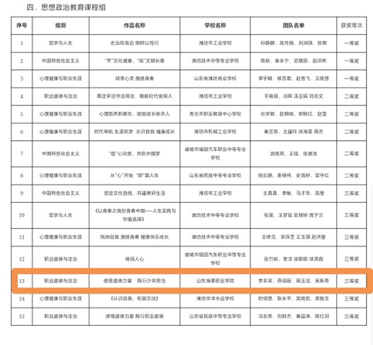 基础部丛雨、张李冠中、张雨晴的《用心用情讲好中国故事,助力地方特色旅游发展》作品获得公共基础课程组三等奖;基础部王嫣然、刘晓康、邵子龙作品《体育--太极拳》获得公共基础课程组三等奖;基础部李丰梁、燕瑞丽、周玉洁、吴新秀老师的《感受道德力量 ,践行少年担当》获得思想政治课程组三等奖。五年制大专学院丁晓宇、高珊 、季丹丹老师的《鉴美提升素养,诵读体认心灵》作品获得公共基础课程组三等奖。