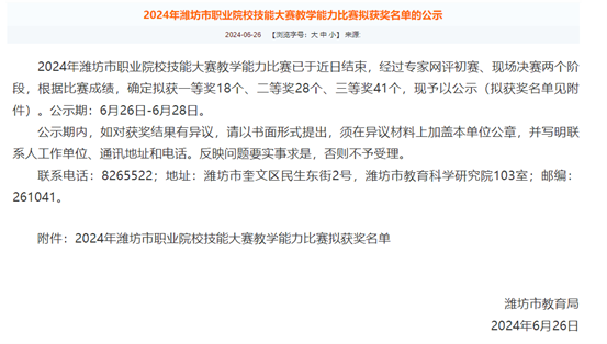 近日,潍坊市教育局公布了2024年潍坊市职业院校技能大赛教学能力比赛获奖结果。我校四支教师团队荣获三等奖。