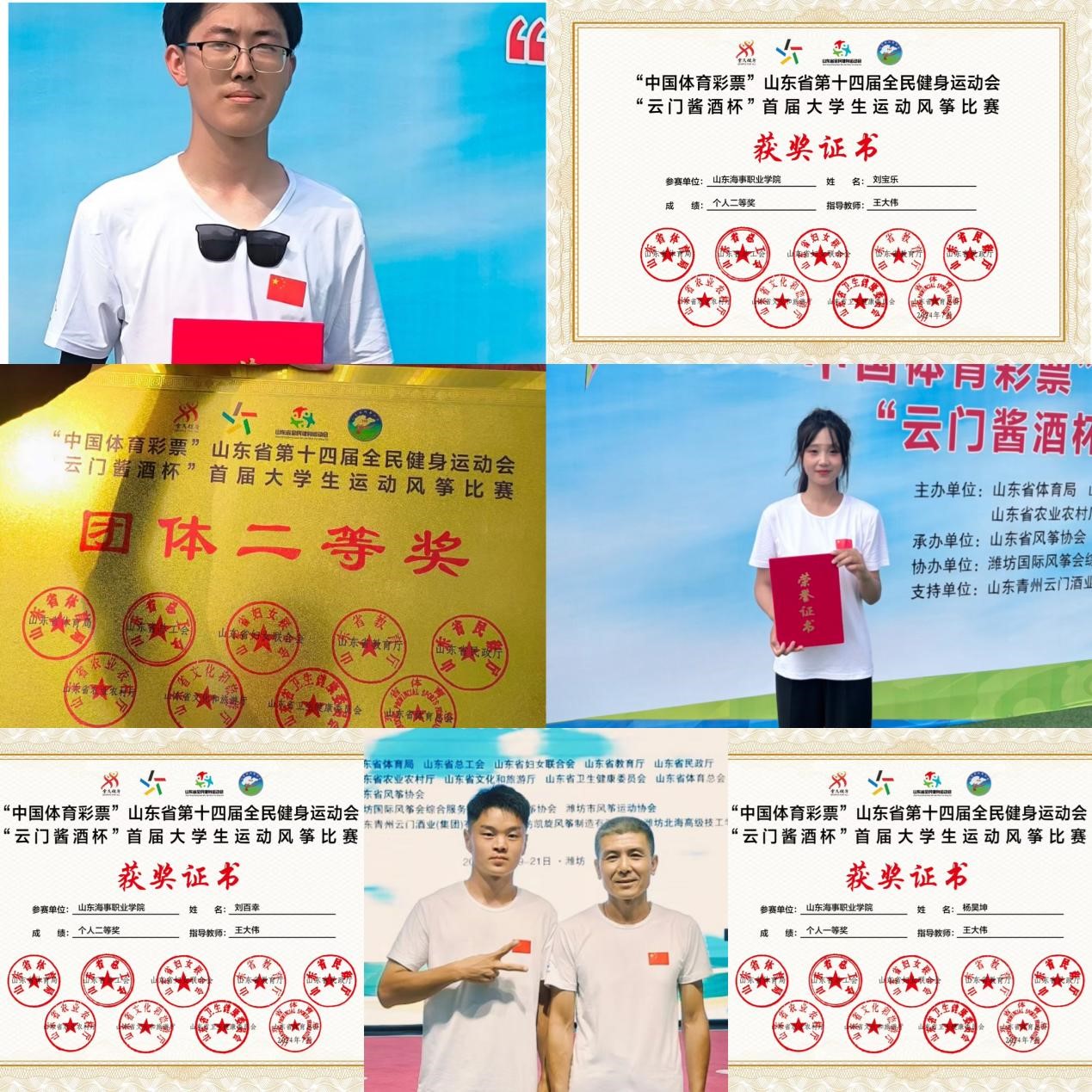 近日,山东省第十四届全民健身运动会首届大学生运动风筝比赛在滨海落下帷幕,本次比赛由山东省体育局主办、山东省教育厅等九个部门主办,山东省风筝协会承办。我校运动风筝代表队获得比赛团体二等奖,个人一等奖1项,个人二等奖2项,王大伟老师通过考核后获得风筝国家一级裁判员。