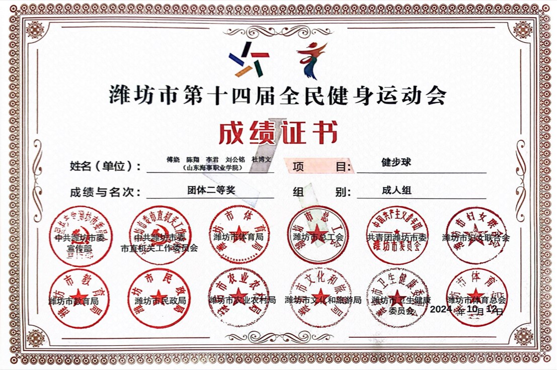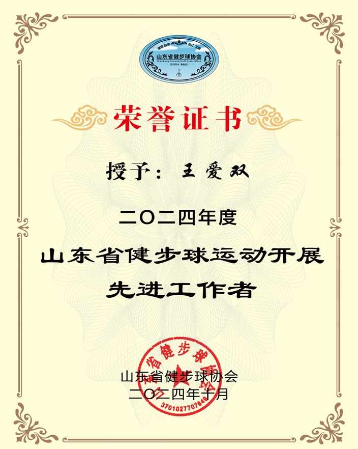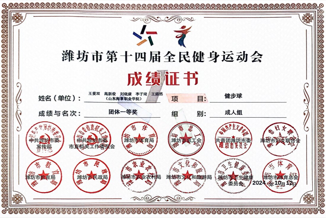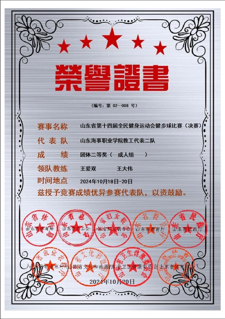 佳绩三:在山东省健步球协会2024年度表彰大会中,山东海事职业学院获得“2014年度健步球运动开展先进单位”;王爱双老师获得“先进工作者”荣誉称号,李子琦老师获得“健步球达人”荣誉称号。