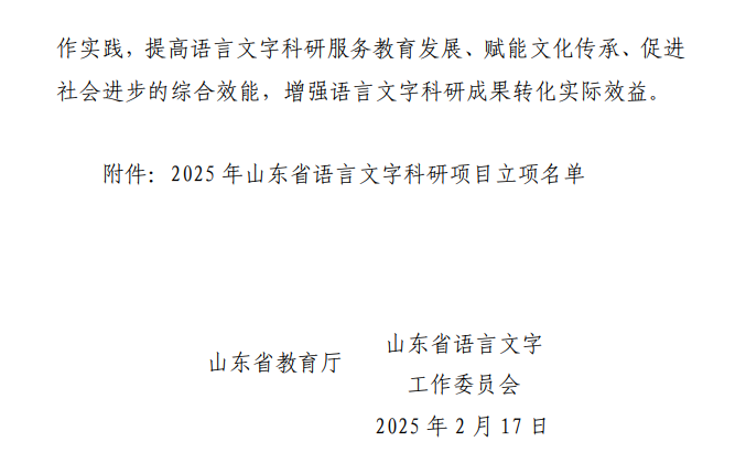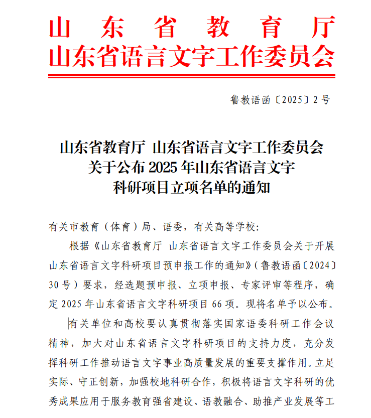 此次立项课题充分彰显了学校在语言文字科研领域的积极创新与探索。一直以来,我校高度重视语言文字工作,积极响应国家语委科研工作会议精神。接下来,学校将进一步加大对山东省语言文字科研项目的支持力度,充分发挥科研工作在推动语言文字事业高质量发展中的关键支撑作用。立足学校实际情况,秉持守正创新理念,全力提升语言文字科研在服务教育发展、赋能文化传承、助力社会进步等方面的综合效能,为语言文字事业的蓬勃发展贡献更多力量。