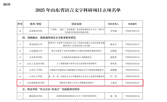 近日,山东省教育厅与山东省语言文字工作委员会联合发布《关于开展山东省语言文字科研项目预申报工作的通知》(鲁教语函〔2024〕30 号)。历经选题预申报、立项申报、专家评审等程序,确定2025年山东省语言文字科研项目66项。我校王爱双老师主持的《教师语言规范与学生心理健康促进研究》成功获批立项。