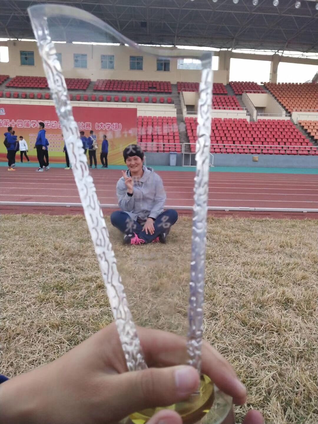 王耀鹏同学在女子铁饼项目上获得第二名;